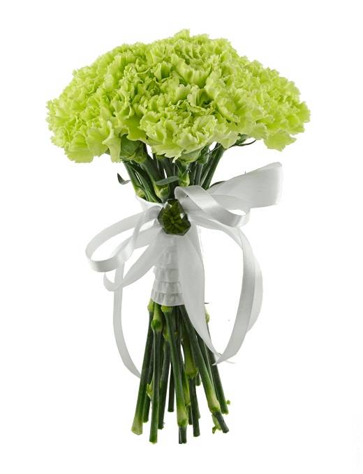 С оригинальным и небанальным букетом будет вовсе не стыдно прийти на первое свидание к девушке. Напротив, она оценит выбор и обрадует вас своим положительным ответом. Невинность цветочной композиции превосходно подчеркивает белая атласная лента. Букет из нежно-салатовых гвоздик можно преподнести и ребёнку – он вызовет неподдельный детский восторг.
